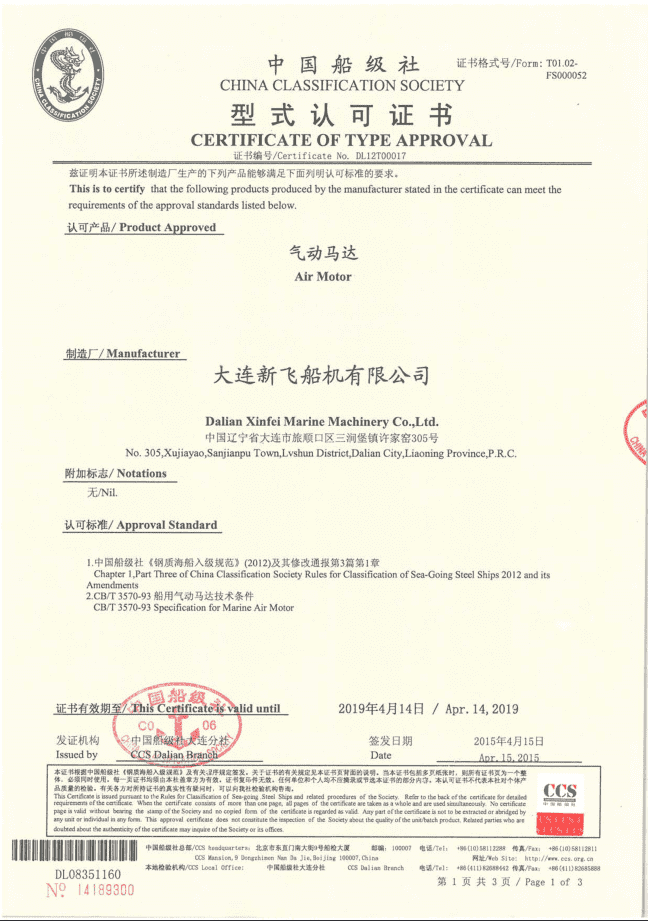 Type Approval-Vane Type Air motor